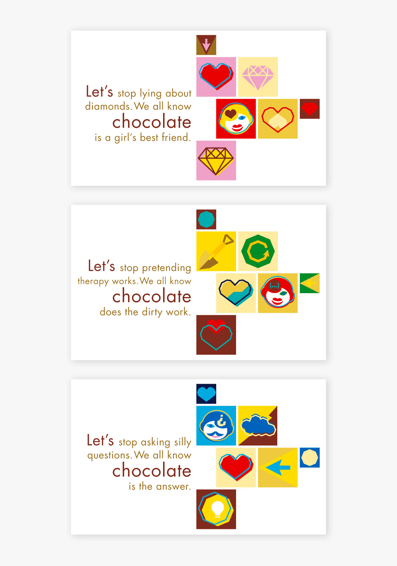 "Chocolate makes life easier". Chocolate packaging for different occasions. Proposal for chocolate packaging. Text: Anabel Hafstad Design: Clarissa Stecher
